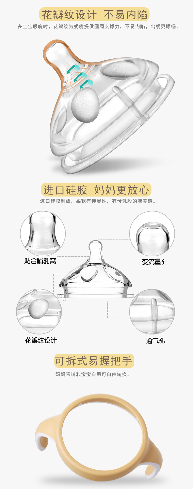 顏 色:都市灰/典雅黃/簡(jiǎn)約白 材 質(zhì):PPSU(奶瓶瓶身呈淡茶色)